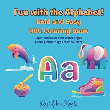 Bold and Easy coloring book with thick lines. There are letters and an image for each letter to color in, as well as the word.